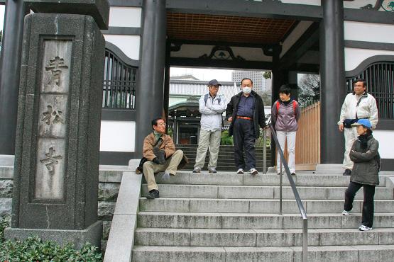 祝田橋交差点を渡り、日比谷公園脇をひたすら東京タワー目指して歩く。途中、塚本さんが所用のため“さようなら!”。 西新橋から愛宕山下へ。「愛宕山は聞いたことはあるが上ったことはない」という皆の希望で、急遽愛宕山の坂道を上ること10分で到着。愛宕山にはNHK放送博物館があるが、時間の関係で見学は省略。山上にある愛宕神社は、もとは1603年にこれから建設される江戸の防火のために徳川家康の命で祀られた神社であったが、「天下取りの神」「勝利の神」としても知られ、各藩武士たちは地元へ祭神の分霊を持ち帰り各地で愛宕神社を祀った。桜田門外の変で井伊直弼を襲った水戸藩の浪士達もここで成功を祈願してから江戸城へ向かったと言う。 さて、帰りは「男坂」の急な石段を降りることに。「やだ~怖い!」と叫びながら、ゆっくりと下りる。余談だが、この石段は「出世の石段」と呼ばれていて、江戸時代・増上寺参拝の折に徳川家光が山上にある梅が咲いているのを見て、「梅の枝を馬で取ってくる者はいないか」と言ったところ、讃岐丸亀藩の家臣(曲垣平九郎)が見事馬で石段を駆け上がって枝を取ってくることに成功し、その者は馬術の名人として全国にその名を轟かせた、という逸話から来ている。 上りではなかったが、怖がっている皆を尻目に、ピョンピョンと走って下りたKさん曰く「小さいとき遊んだ裏山の方がもっと傾斜が急だったよ」さすが、野生人のKさん! 3.東京タワー