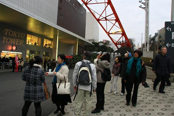 都会にもこんなに緑が多く、広々として気持ちの良い公園があったなんて、と感激しながら芝公園を抜け、ついに東京タワーに到着。ここで、河野さん、清水さんが所用のため“さようなら!”。チケット売り場やエレベータ乗り場は、かなりの混雑だったが、そこは人生経験の豊富な私たち、チケット購入は一人に任せ、後はエレベータの列に並ぶ。 150mの大展望台へ到着。童心に帰って、目の前に広がる大パノラマに興奮のしっぱなし。そろそろ空腹を覚え、いつまでも見飽きない素晴らしい眺めに別れを告げることに。なんと帰りは、約600段の外階段を下りるという冒険を体験。でも、思っていたほど怖くなく、外の景色を堪能しながら、途中で記念写真を撮る余裕も。約15分かけて地上に下り立つ。 時計の針は5時。さてさて、あまりの空腹に機嫌が悪くなりつつある人もチラホラ、芳賀さんとはここで“さようなら!”して、一行はグルメの部へ。 4.グルメの部
