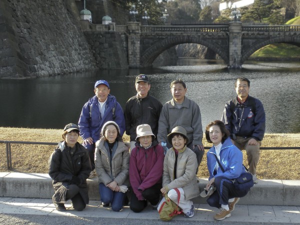 1周目は8名で、スレッチ、二重橋前記念撮影の後午後1時50分ごろスタート。久しぶりにYMさんが参加。SM君もご夫妻揃っての参加だった。きょうも快調に先頭をMNさんが10分/Kmのペースで歩く。