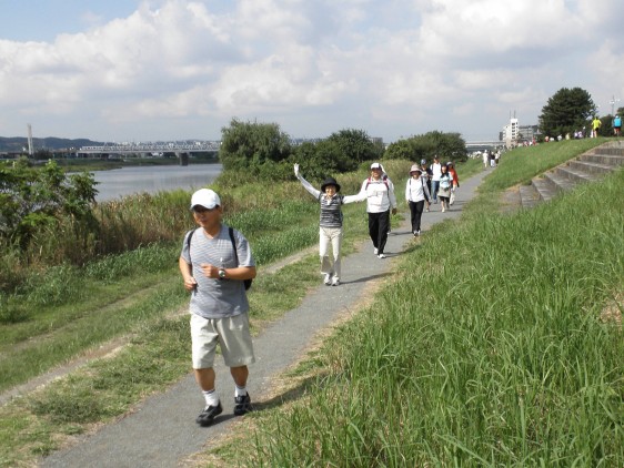 多摩川児童公園で受付を済ませ、各自ゼッケンをセットした後、軽くストレッチ。すぐにウォーキングを開始。下流に向かって多摩川河川敷コースを歩き出す。