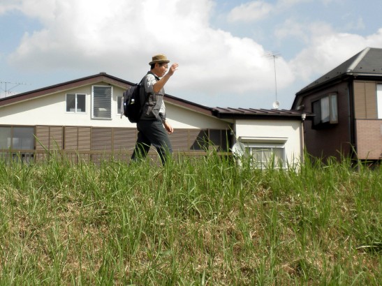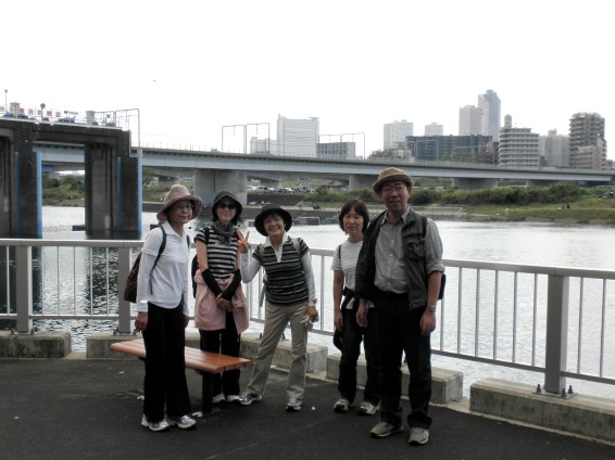 狛江の多摩水道橋を通過し、二子玉川の数キロ手前で小休止。気温が上昇しており、まず水分補給を行なって歩行を再開する。30分ほどで二子玉川河川敷の兵庫島公園(世田谷区)に到着。ここはスタートから9km地点。堤夫妻はここで離脱しましたので、少し休んだ後で残り9名でリスタート。