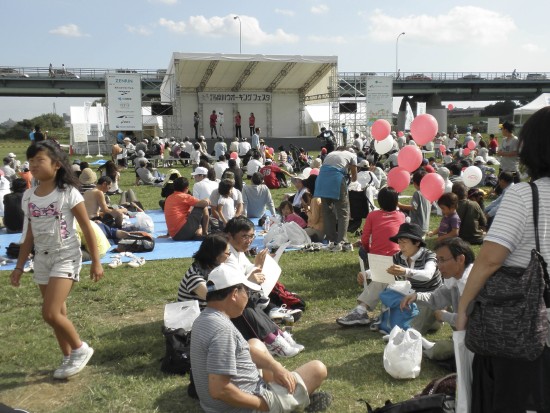 1時間ほど歩いた後、後続が遅れ気味でしたので小休止。9名がそろった時点で力を振り絞って懸命に歩く。13時30分頃、ゴールのガス橋緑地に全員到着する。17km完歩証をもらった後、とにかく暑いので模擬店会場でまずはビール。スポンサー企業等の展示を見た後、メイン会場芝生で抽選発表を待つ。