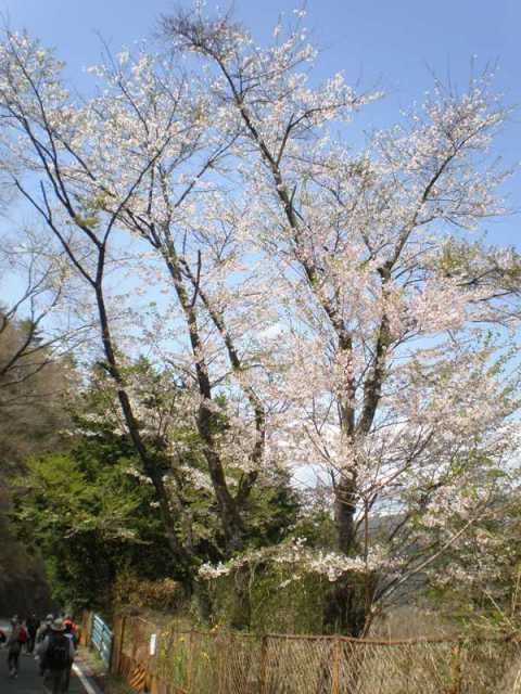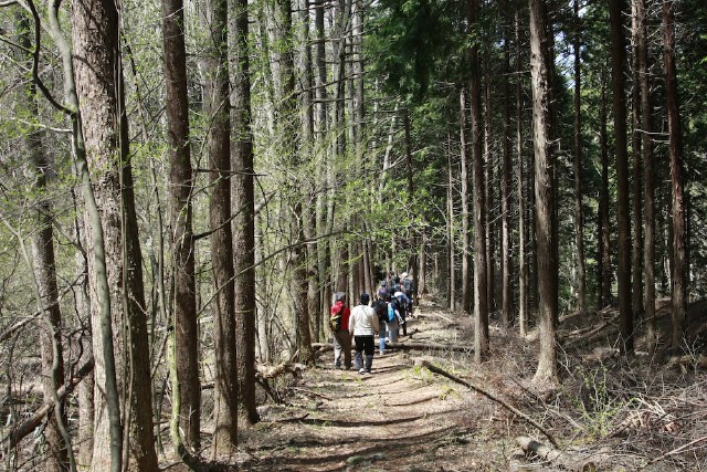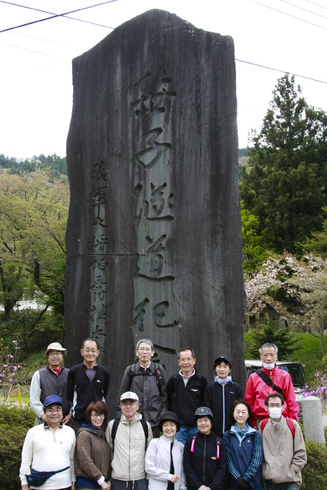 記念写真、ウォーミングアップの後午前10時に笹子駅を出発。春の晴れた日となり、すがすがしくさわやかな空気であった。少し空気はひんやりしていた。20号線を笹子峠方面にわずかな上り坂を歩き始めた。少し寒さを感じていたがすぐに暑くなり、汗ばむほどになった。30分歩いて小休止。早速KM君が駅近くの「緑屋」で購入していたあのなつかしの「笹子もち」を皆でいただいた。旧々甲州街道、笹子峠に入り急な上り坂もあった。しかしそこは足腰を鍛え抜いている44会メンバーでありほとんど苦にせずどんどんと進んだ。しかし昔の人はこの峠を歩いたのだなと、中央高速道を普段利用する者としてあらためてそのたいへんさを認識した。途中、標高899mという水準点があった。1925年測量との記載があった。次は、「矢立のスギ」というかなりの古木。天然記念物に指定されているとのこと。そのスギの木を歌った杉良太郎の唄があり、ぜんまいで聴けるレコーダーも設置されていた。