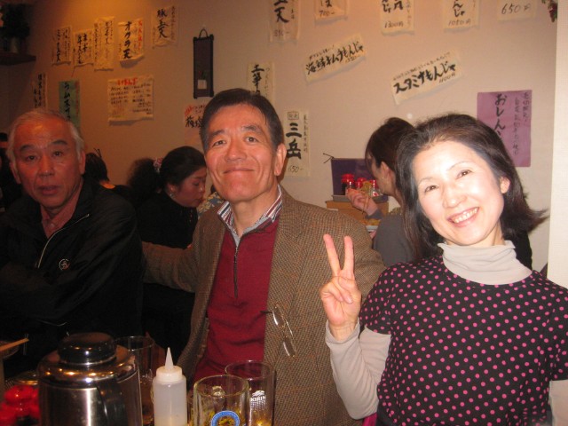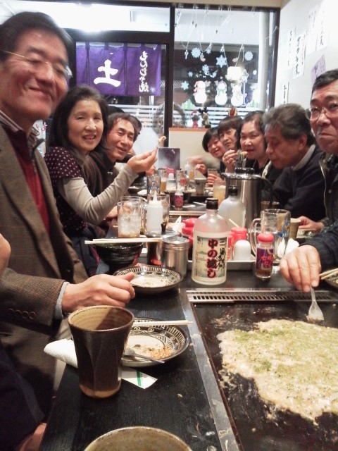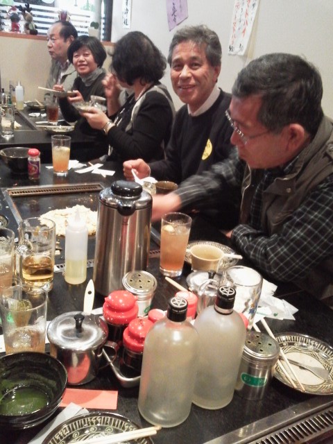 ビールで乾杯後、焼酎ボトル3本、引き続きビール、サワーの人もいてよく飲む。漬け物、いか焼き、きのこ焼きから始まり、もんじゃはめんたいチーズ、梅しそこんぶ、カマンベールと続いた。その後はテーブルごとにお好み焼き、四川もんじゃ、昔ながらのもんじゃ(という名前)等。締めはあんこ巻き、アンズ巻き。薄く皮を焼くテクニックは地元のMTさんにお任せした。午後8時20分終了。約3時間はほんの10分ぐらいにしか感じないほど早かった。