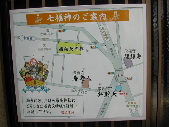 午後1時10分出発。新宿駅東口は若者でごった返していた。混雑の新宿通りを歩いて、今回の「新宿山ノ手七福神」めぐりのひとつ目は、15分歩いて到着。以下訪問した七福神を示します。