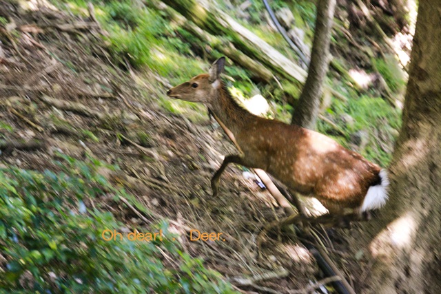 12:40大山寺を出発し、最後のきつい登り階段を登った。途中、鹿の親子連れ3頭に出会った。少しようすを見ていたと思ったら突然登山道に出てきて急速で目の前を横切っていった。迫力がある光景であった。13:05阿夫利神社下社着。