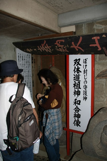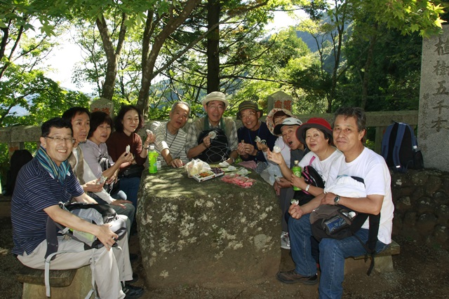 その6のみ、急な階段の途中にあったようで通り過ぎてしまったようだ。他はすべて確認できた。意外と険しい登り坂で、ほとんどが石の階段。但し、きちっと整った階段ではなく高さも並びもかなりバラツキがあり、油断ができないもの。慎重に一歩一歩登った。途中、大山寺に12:05着。昼食休憩とした。各自おにぎり等の昼食。漬物、なし、チョコレート、信玄飴の指しれをいただいた。