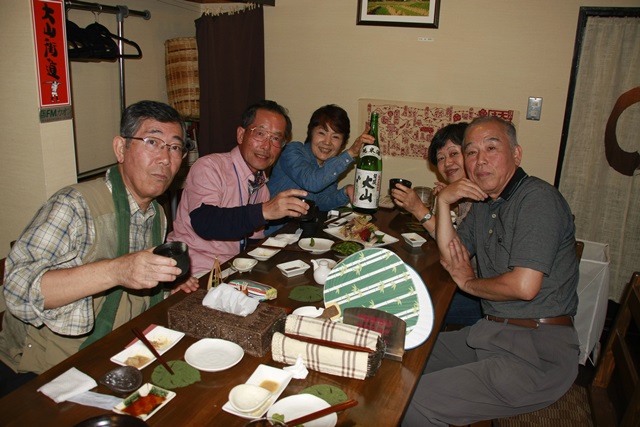 16:10スタート。料理はおまかせで、まさに伊勢原で採れたという地野菜、大山の豆腐、相模湾で獲れた魚の刺身とマグロ竜田揚げ、地場の肉としてとん漬け(豚肉の味噌漬け)他。お酒は地酒の純米酒「大山」。ビールで乾杯後、この地酒を一升瓶で注文。その後はカリフォルニアの赤ワインをボトルで2本。やはりたくさん飲む仲間である。