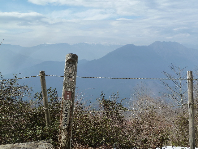 本堂からロープウェイに乗って身延山山頂へ14時15分着。1153mの山頂はまだ雪が少し残っていた。北側展望台からの眺めは、雪の鳳凰三山、白根三山が見えた。またちょうど眼下は2月の大雪で陸の孤島となり全国的にも有名になった早川町でした。