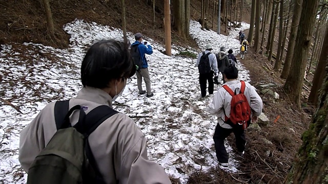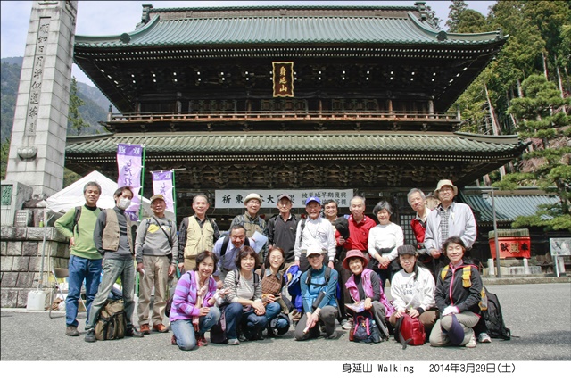 帰りは、ロープウェイで戻る組と歩いて下る組に分かれた。歩く組は、14時35分出発。雪の残っている急な下り坂はゆっくりと慎重に、その後はだんだんとペースは上がった。案内書では距離約5Kmで1時間半から2時間かかるコース。途中三光堂で10分の休憩を含めても、44回メンバーは65分で下り終えた。再び久遠寺本堂前に全員が集まり、休憩後16時帰路に。途中おみやげ屋さんで、買い物。文化会館の駐車場に16時40分着。本日のウォーキングはここで終了。本日の歩行距離計16Km。16時55分車で甲府へ向かった。