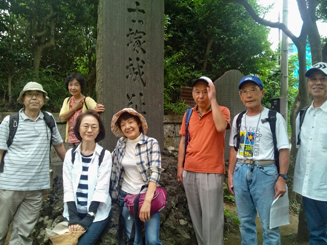 相鉄いずみ野線沿いに西に向かい、まず「富士塚城址」の石碑があった。ここは、源頼朝が石橋山に兵を挙げたとき、平家側関東総大将大庭影親に従いながら、頼朝を助けた飯田五郎家義の館があったといわれるところ。実際に城があったのはここより少し東、富士塚団地内とのこと。