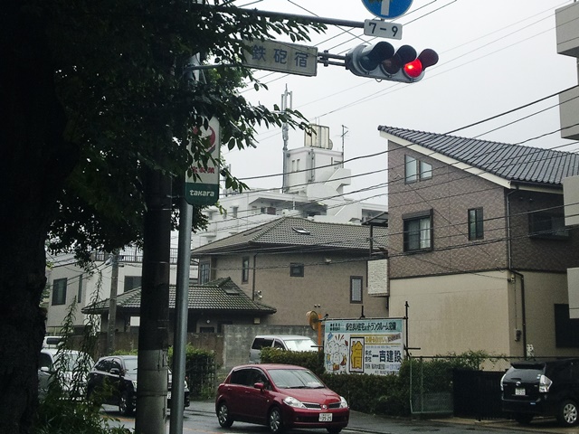 左手高台ににすごい高層の建物が見え、芳賀君が近くを歩いている人に聞いたところ横浜薬科大学であった。雨の中をさらに歩き、「八坂神社」に午後3時05分着。ここで本日一回のみの休憩。ミント黒糖、MILOミニ、トマト味ポッキーの差し入れをいただいた。雨の中で蒸し暑くかなり汗をかいた。15分ほどの休憩で出発。