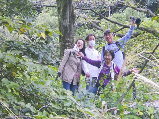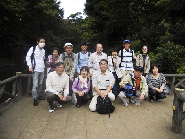 約1時間半の園内散策後、自然教育園出口近くのベンチで休憩、記念写真。差し入れとして、くるみ黒糖、グミ、塩せんべい、ぶどうをいただいた。