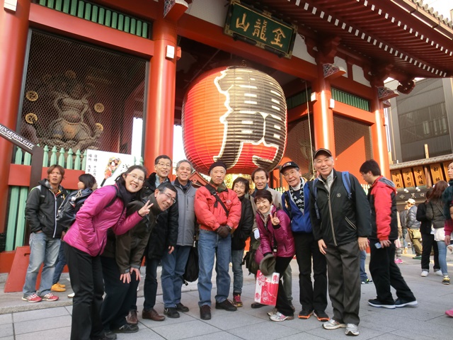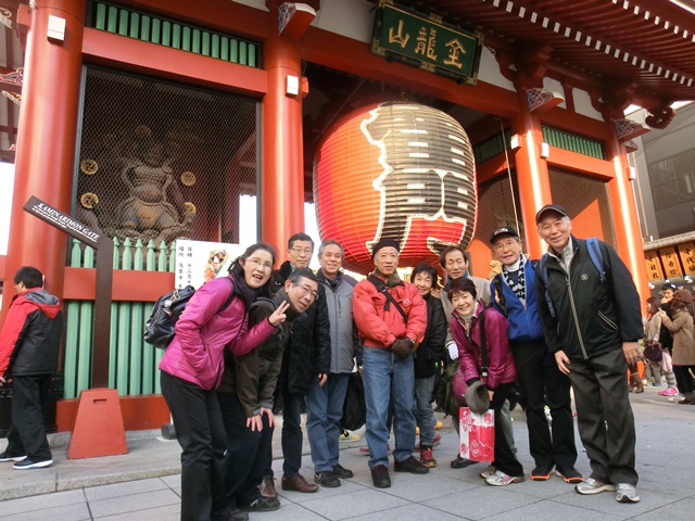午後1時半浅草雷門前集合。冬の晴れた日となり先月の雨とは打って変わったウォーキング日和でした。雨男の仲澤君の力をあらためて感じました。典型的な西高東低の冬型の気圧配置で日本海側は大雪の様子、太平洋側は乾燥して気温が低いが快晴の天気。