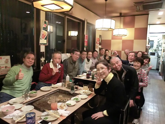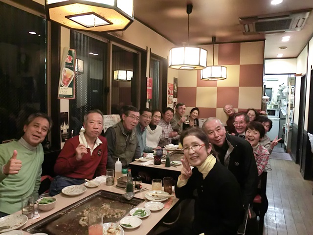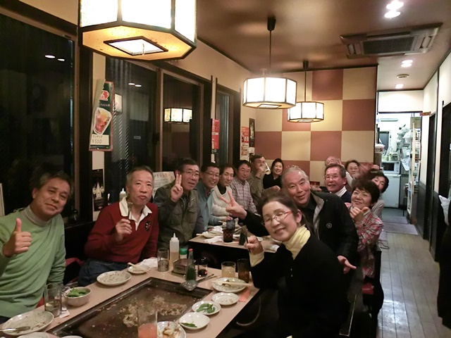 久しぶりのもんじゃ焼きでのグルメの部。本年の忘年会を兼ねて計15名の参加。にぎやかに始まりました。以前何回もお世話になったもんじゃ焼き「土筆倶楽部」は2013年7月に閉店となり、その後初めてのもんじゃ。今回は新たに三田さんが発見、紹介していただいた店「えびすや」でした。