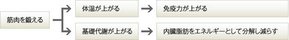 体温が1℃上がると免疫力は5~6倍、体温が1度下がると免疫力は30%低下すると言われています。また体温が下がる要因のひとつに筋肉量の減少があります。何もしなければ筋肉量は年齢とともに減少します。しかし筋肉は鍛えて維持、増強することができます。下記のような構図があります。適切なウォーキングによって筋トレができます。筋肉が多いほどエネルギー消費は多くなり、体温が上がり、基礎代謝量が増えます。同じ量を食べてもむだな脂肪がたまることが少なくなります。