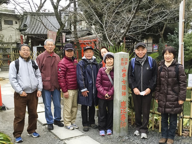 本年1回目の44会ウォーキング。すでに100回を過ぎて新たな歴史に入っている。天気予報では雨または雪でかなり冷え込むとのことだったが8名が集まった。この山手七福神は割と近い距離にありのんびりと歩くことができた。幸いにも雨も雪も降らず、寒さもそれほど厳しくならずよかった。いつものように楽しく飲んで、食べて健康を求めている。どこまで続くのか、44会ウォーキング。今はまだ"永遠に"という思いだけである。皆で努力をしながら、健康な高齢者でいつまでもいられるようにがんばりましょう。本年もよろしくお願いいたします