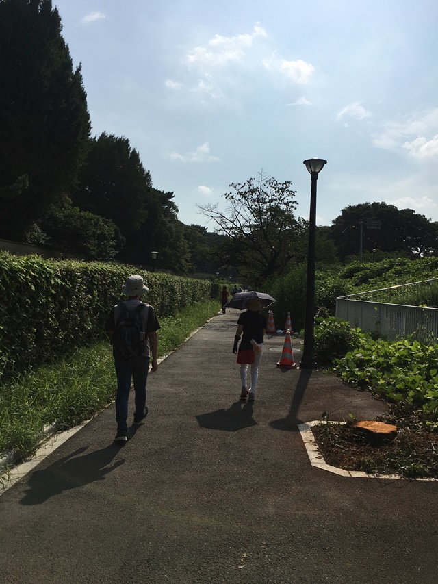 この日は一頃よりは暑さは和らいだが、まだ真夏日は続いていた。13時20分に桜田門時計台に着くと磯貝君が一人で待っていた。声をかけると、不安そうな顔がほころんだ。30分を過ぎてから続々と皆集まってきて7名となり、格好が着いた。当初の予定は代々木公園だったので、東御苑を通り四谷から北上して行こうということになった。 Report by S.Noda |