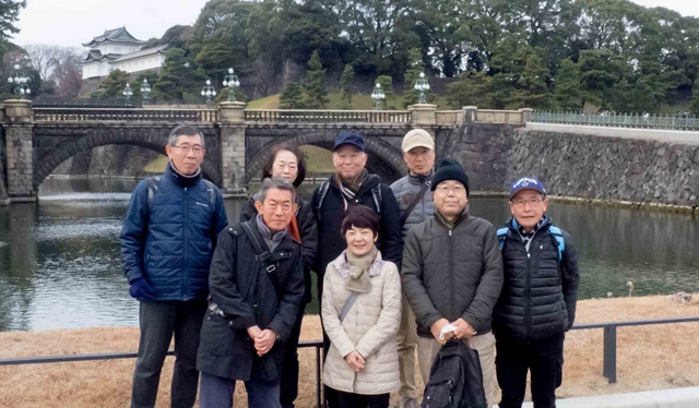 午後1時半皇居桜田門に8名が集まった。天気は曇り。先月のウォーキングに続きかなり冷え込む陽気となった。とは言え、歩けばからだは暖まり、寒さを感ずることはなかった。1時45分スタート。久しぶりに二重橋前での記念撮影。まずは大手門から東御苑へ。