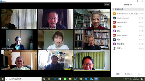 9名が無事zoomにてつながりました。清水さんもアクセスしていただきましたが、なぜか、つながらないまま切れてしまいました。すみません。原因がわかりません。