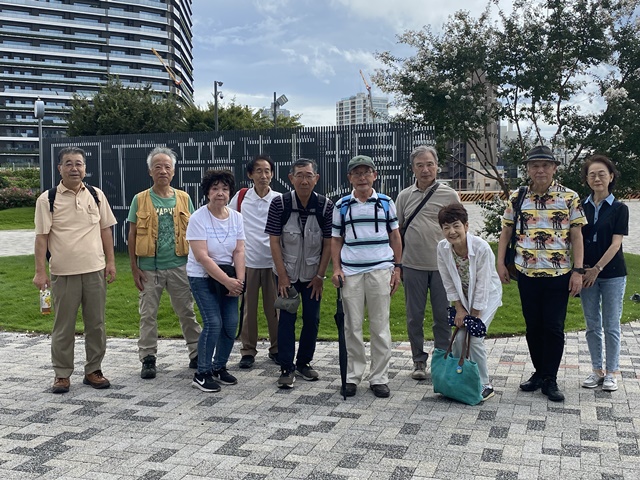 三田さんも用事で帰り10人のウォーキングとなり、空模様が怪しいので、まだ晴れているうちに国立競技場の「空の杜」というテラスに行き、散策する。途中、集合写真を女性に頼みテラスを一周しようと歩いていると、その女性が今度は前からやって来るので、こんなに早く一周できるのかと驚いたが真相は不明。