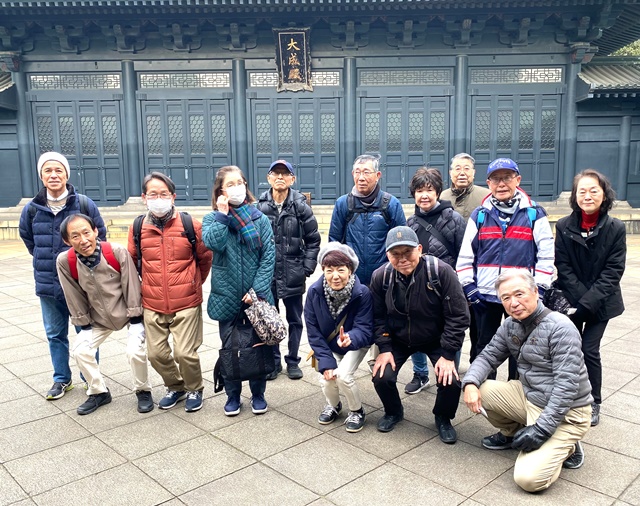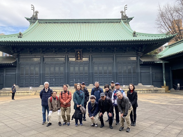 今回は初詣を兼ねて歩こうということになり、JR御茶ノ水駅聖橋口に13名が集まった。本当に久しぶりの飯野さんも参加してくれて、この時期には珍しい暖気のなか、まずはすぐ近くの湯島聖堂に行く。