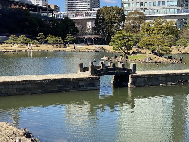 ここは老中大久保忠朝の上屋敷の庭園「楽寿園」が始まりで、大正13年東京市に下賜され「旧芝離宮恩賜庭園」として公開された。庭園内は海水を引き入れて泉水を作り、三つの中島には「西湖の橋」がかかっている。園内には桜の木も多かったが、ここのところの寒さでまだ蕾の状態。