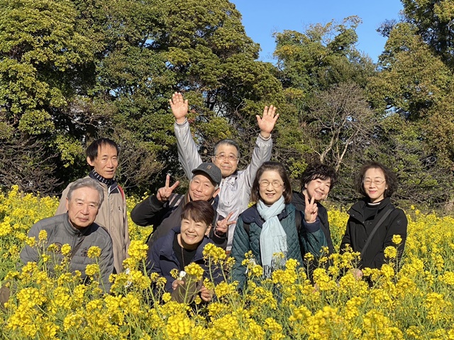 次にビル風の寒風の中、浜離宮へ歩いていくと正門とは違う「中の御門」から園内に入る。ここは潮入の池と二つの鴨場を持つ江戸時代の代表的な庭園で、四代将軍家綱の弟で甲府宰相の松平綱重が、広大な鷹狩り場に別邸を建てたのが始まり。桜はまだだったが、広大な菜の花畑がまだ咲いていて写真を撮ると皆の顔が黄色く染まって美しかった。