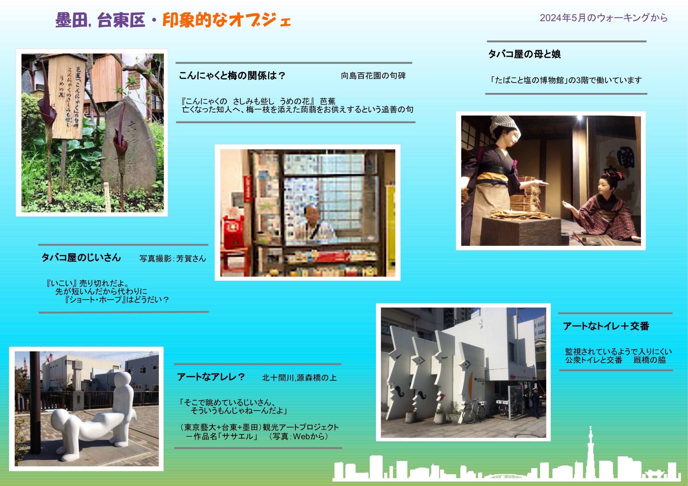 隅田川沿いを歩いて今度は「たばこと塩の博物館」に着き、「袋物商」の特別展を鑑賞、煙草入れから信玄袋の逸品を見る。ここは日本専売公社により1978年に渋谷の公園通りに開館、2015年に移転した、なかなかユニークな展示で楽しめた。