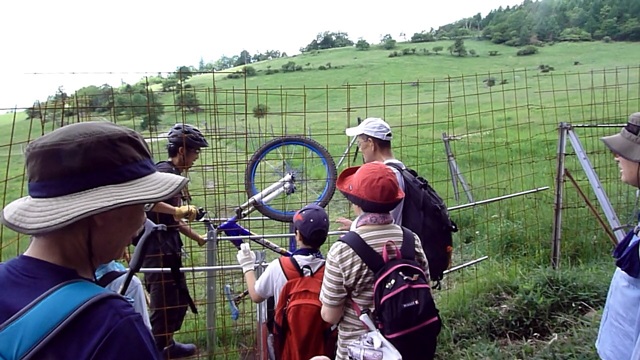 マウンテンバイクで来た青年がやっとの思いで柵を抜ける