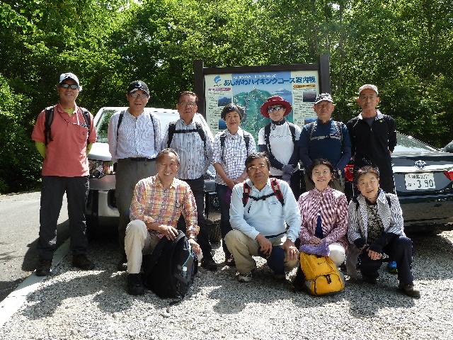 まずは全員で記念撮影。ここから車道を1時間ほど上ると、あたり一面は「ハルゼミ」の天国。にぎやかな鳴き声が林の中に響き渡っていた。ここで小休止。持ってきた「おやつ」を分け合い10分休憩。