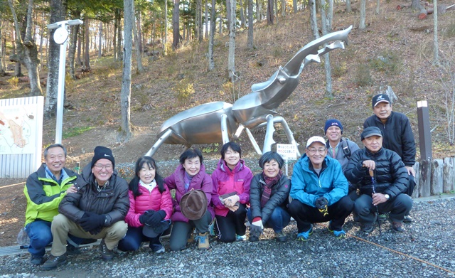 広域農道を横切り、更に急な登坂。10時10分頃、穂坂自然公園に到着、先ずは公園内を軽くウォーキング。クワガタのモニュメント・鳳凰三山をバックに記念撮影。