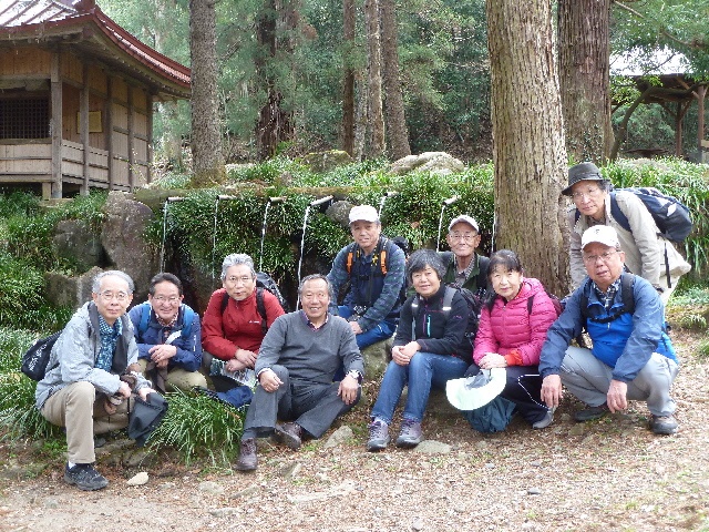 朝から、怪しい天気!7時過ぎ頃から少々の雨が降り出す。 参加者には、「傘持参で決行します」との急遽メール発信。 午前8時半過ぎ、甲府市中道支所・農産物直販所に集合。 2台の車で境川スポーツセンター駐車場に向かった。 先ずは、集合写真、境川に沿って歩き出す。 境川小学校を横目に上り坂、市川三郷町に続く広域農道を歩く。 藤垈の滝入口から更に上り坂。突然雨が降り出した。 歩き出して丁度1時間、藤垈の滝に到着。 あずま屋で持参したコーヒーを沸かし、御茶菓子を口にしながら喉を潤す。 N君は昔の懐かしいお茶菓子を最近持参してくれるのでとても楽しみだ。 いつかは「五家宝」を持ってきてくれた。 休憩後、後ろの公園内にある現代作家の作品展を見学。 ここで困った事が起きた。草むらを歩いたので、「バカ」が付いた。 キョエちゃん曰くの「岡村のバカー!」じゃあないけれど、この「バカ」は山梨の方言だろうか?それとも全国的に通じるのだろうか・・・・。 そんな話をしながら、湿地帯の水芭蕉を見学。 向昌院を抜けて、智光寺の「カヤの木」は山梨県指定天然記念物とあって見事だった。 かいじ国体の時にできた自転車競技場を見ながら帰路についた。 Report by J.Yamamoto |
