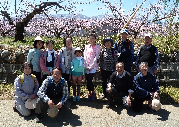 午前9時45分に韮崎陸上競技場に到着。 受付後、ラジオ体操で体をほぐし、10時のスタート。 東京エレクトロンの横から畑に入る。 白根三山、八ヶ岳は雪を被ってとてもきれいだ。 新府城の西側から本丸跡に登り一休み。 満開の桜の木の下で記念撮影。 そこから桃畑を通り抜け新府共選所で豚汁の接待を受けた。 あまりにも美味しく、男性は勿論、女性陣も皆お代わり! 丁度そこに韮崎出身のモデル・タレントの「若尾綾香」さんがいて桃畑と南アルプス連山をバックに一緒に記念撮影。 ゴールまで戻り、大村智先生宅横の白山温泉(無料券)で体をほぐし隣のそば処「上小路」でそばの舌鼓。 参加費1,000円で入浴、豚汁(お代わり自由)給水、お菓子等々はとても満足のウオーキングだった。 Report by J.Yamamoto |