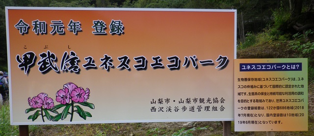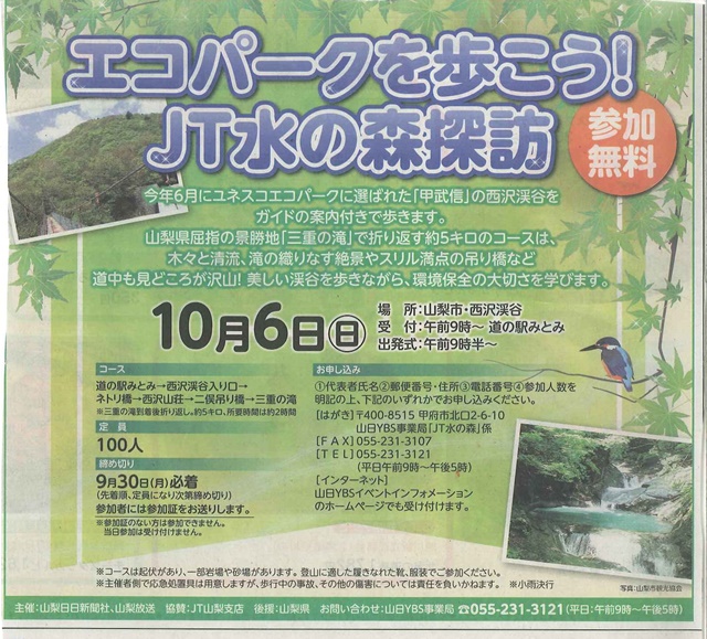 午前9時山梨市三富の道の駅みとみ集合。8時半に到着した時はほぼ全員集まっていた。相変わらず皆、早い。曇り空の天気で、少し寒いかなと感じていたが、歩き始めたらすぐに暑くなり、汗をかくほどであった。曇りから晴れになり絶好のウォーキング日和であった。 山梨日日新聞社・山梨放送主催、JT日本たばこ産業株式会社山梨支店協賛のイベント「エコパークを歩こう! JT水の森探訪」に参加。募集人員100名に対してすぐに定員いっぱいになったとのこと。山本仁一君のお力で、15名を確保したとのこと。東京からの3名を含めて15名ピッタリそろったのも山本君のご努力の結果でした。 このイベントは、「甲武信(こぶし)」(構成地域:山梨県、埼玉県、長野県、東京都)について、今年6月、ユネスコエコパークへ登録することが決定されたことにちなんでの企画。ユネスコエコパークは、生態系の保全と持続可能な利活用の調和(自然と人間社会の共生)が目的で、各国からの推薦によりユネスコが決定します。日本では計10か所が登録されていて、山梨県では南アルプス(山梨県、長野県、静岡県)も2014年に既に登録されています。 9時半から開会式。山日、JT関係者の挨拶、今回ガイドをしていただける「西沢渓谷ガイドの会」の方からの注意事項説明、準備運動の後、予定通り10時スタート。計100名を10名づつ10組に分け、それぞれにガイドひとりが案内していただけた。 今回のコースは、西沢渓谷入口から、三重の滝までの往復で、短い距離。片道1時間の予定だったが、ゆっくりペースで、行きは1時間15分で三重の滝着。滝の展望台で少し休憩後、すぐに帰路へ。 帰りはほぼ1時間でスタート地点に昼12時25分着。途中ネトリ大橋、、廃業になった西沢山荘、田部重治文学碑、二俣吊り橋を通って三重の滝へ。山、渓流、木々、草花すべて自然であり、美しい。三重の滝前ではマイナスイオンをたっぷり吸って帰った。 ガイドさんの説明によると特に滝の前では、マイナスイオンは普通の場所の100倍あるという。主にストレス軽減効果・リラックス効果などがあるとのことです。ガイドさんの説明も、下記のようないつも聞くことができない話しもあり興味深かった。 途中ナレイ沢という川を渡ったが、この川は笛吹川の上流で、地元の人は笛吹川のことをナレイ沢と言うそうです。秩父多摩国立公園は有名ですが、その中には山梨県も多くの部分が含まれています。しかしその名前が入っていないことに苦情を言った人がいるようで、最近西沢渓谷内の看板が上書きされ「秩父多摩甲斐国立公園」になっていました。山梨県の山で人名の付いた山が二つあるとのことです。一つは小太郎山、もう一つは聞き逃しました。 昼12時半前にスタート地点に戻り、山梨ウォーキング恒例のコーヒーを皆でいただいた。約2時間の山歩きとこのコーヒータイムでコミュニケーションがいっぱい取れることがいい。心身ともに健康的な山梨ウォーキング。 ありがとうございました。 Report by Y.Kamiizumi |